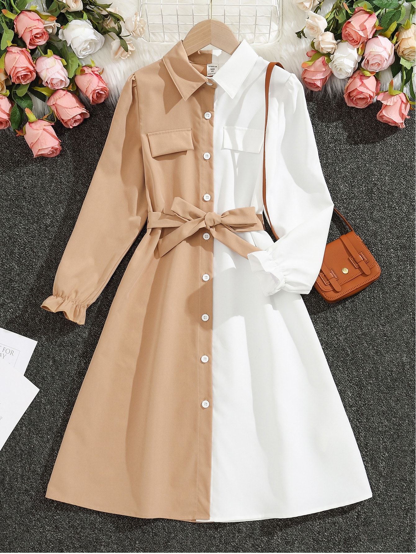 Girls Two Tone Flounce Sleeve Belted Shirt Dress